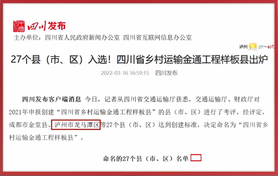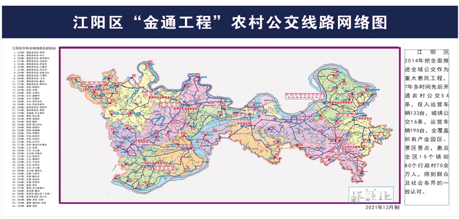 助力龍馬潭區以公交為紐帶實現了半小時經濟圈,在江陽區實現全域公交村村通。江陽區54條農村公交線路惠及群眾50萬人。在目前的公交線路中,全域公交、農村公交線路占比達34%,江陽區“金通工程”全域公交先后2次在全省作經驗交流,并獲得“四川省鄉村運輸金通工程樣板縣”殊榮。