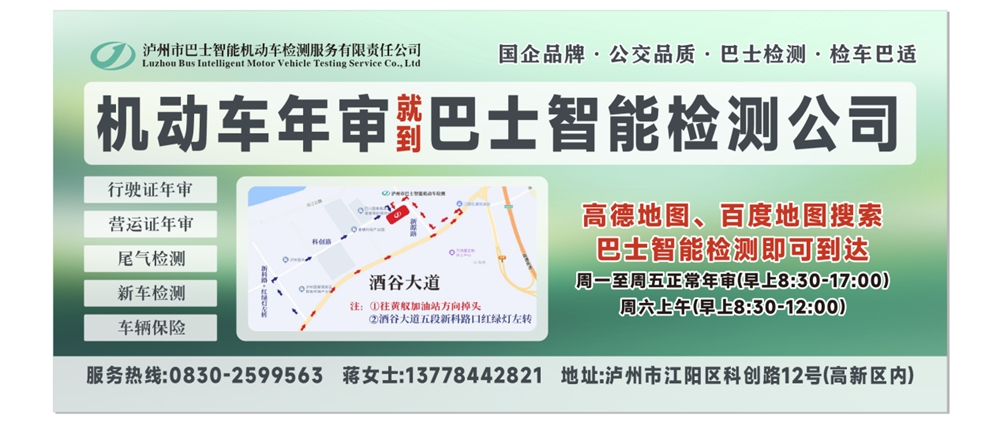 瀘州市巴士智能機動車檢測服務有限責任公司占地面積地20余畝,是瀘州市公交集團全資子公司,位于瀘州市江陽區科創路12號(高新區內)。檢測場站服務項目齊全、設備先進、管理規范、實力雄厚,檢測人員優秀,技術力量精湛。本公司堅持“公正公平、科學準確、以人為本、高效服務”的宗旨,一切為客戶著想,全面為客戶提供規范檢測、誠信服務,為受檢車輛提供可靠的檢測數據,為瀘州市機動車安全運行提供支撐和保障。