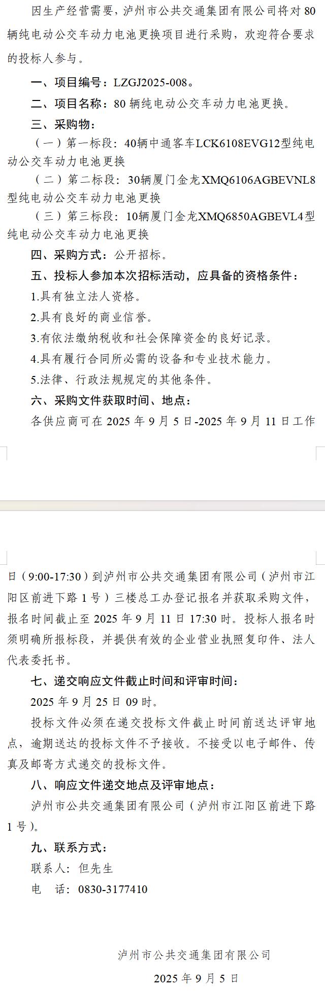 瀘州市公共交通集團有限公司動力電池更換采購公告